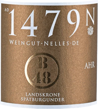 Der B-48 Spätburgunder Heimersheimer Landskrone GG von der Ahr aus der Feder von Weingut Nelles von der Ahr offenbart im Glas eine leuchtende, hellrote Farbe. Leicht schräg gehalten, offenbart das Burgunderkelch an den Rändern einen charmanten granatroten Ton. Schwenkt man das Glas, dann kann man bei diesem Rotwein eine erstklassige Balance wahrnehmen, denn er zeichnet sich an den Glaswänden weder wässrig noch sirup- oder likörartig ab. Dieser sortenreine deutsche Wein präsentiert im Glas herrlich vornehm und komplex Noten von Rosinen, Schattenmorellen, Schwarzkirschen und Früchtebroten. Hinzu gesellen sich Anklänge von weiteren Früchten.