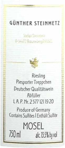 Dieser balancierte Weißwein aus Deutschland wird aus der Rebsorte Riesling vinifiziert. In der Mosel wachsen die Reben, die die Trauben für diesen Wein hervorbringen, auf Böden aus Schiefer. Die Trauben dieses Weißweins von Günther Steinmetz wachsen zudem nicht etwa im flachen Land, sondern graben in Steillagen ihre Wurzeln in den Untergrund. Die Steillagenbewirtschaftung stellt sicher, dass auch in kühleren Weinbauregionen mit weniger langen Vegetationsperioden die Weinreben ein Maximum an Sonne einfangen. Dieser Deutsche Wein kann im besten Sinne des Wortes als Wein der Alten Welt bezeichnet werden, der sich außerordentlich komplex präsentiert. Die Weinbeeren für diesen Weißwein aus Deutschland werden, nachdem die optimale Reife sichergestellt wurde, ausschließlich von Hand gelesen. Nach der Lese gelangen die Weintrauben auf schnellstem Wege in die Kellerei. Hier werden Sie sortiert und behutsam aufgebrochen. Es folgt die Gärung bei kontrollierten Temperaturen. Der Vinifikation schließt sich eine Reifung für einige Monate in Fässern aus Eichenholz an.